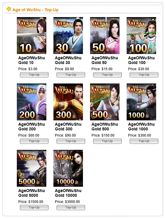 There are four types of main currency in Age of Wushu: Silver Coins, Taels, Gold, and Bank Notes. Other forms of currency include Relaxation & Expert Points, School Contribution, and Credits. The currencies do not exist in an item form and therefore do not occupy any backpack slots. The Silver Coins and Taels can be deposited into the bank.