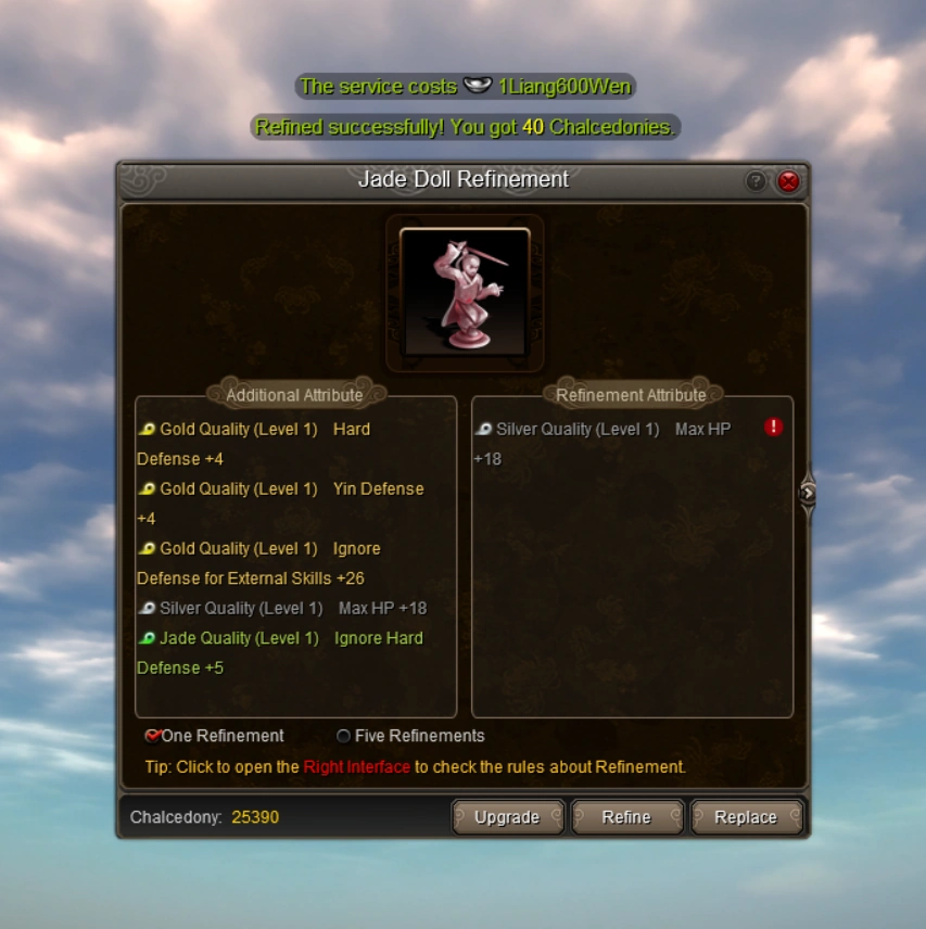 The following example demonstrates the refining and upgrading process for a Jade Doll.