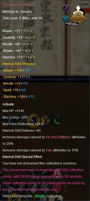 Chi of the Sunflower: The flow of Chi might be freed from each move. No cool down time restrictions for moves of the same skill set within 20 seconds.